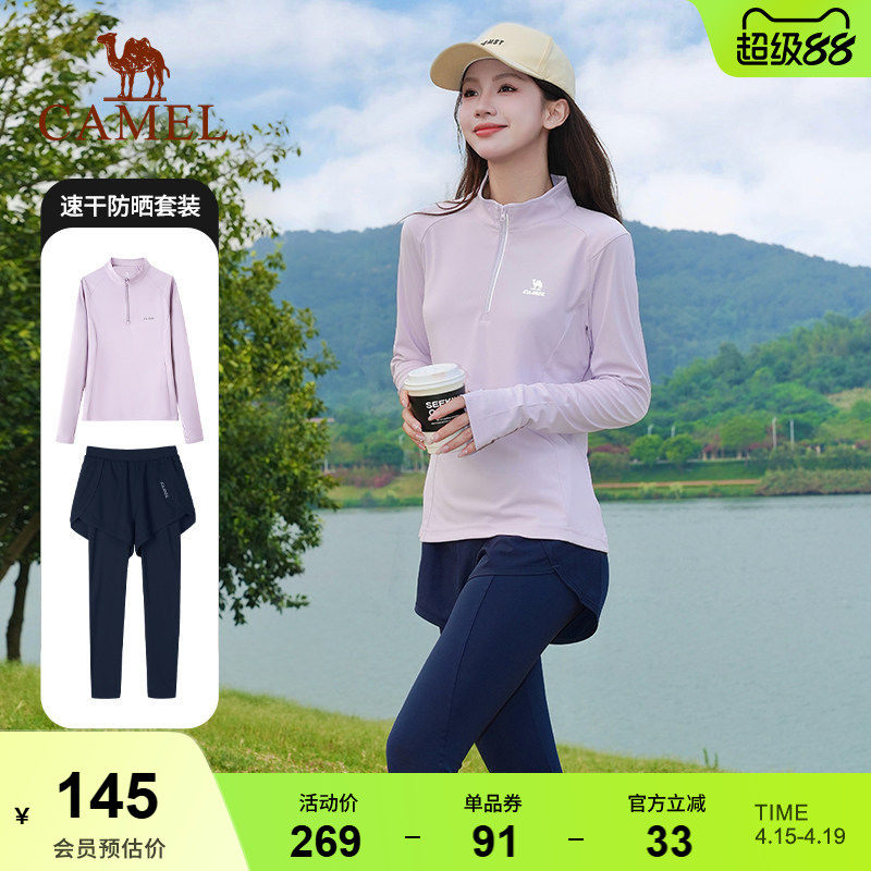 骆驼运动套装速干透气春秋休闲加绒立领上衣瑜伽健身假两件九分裤