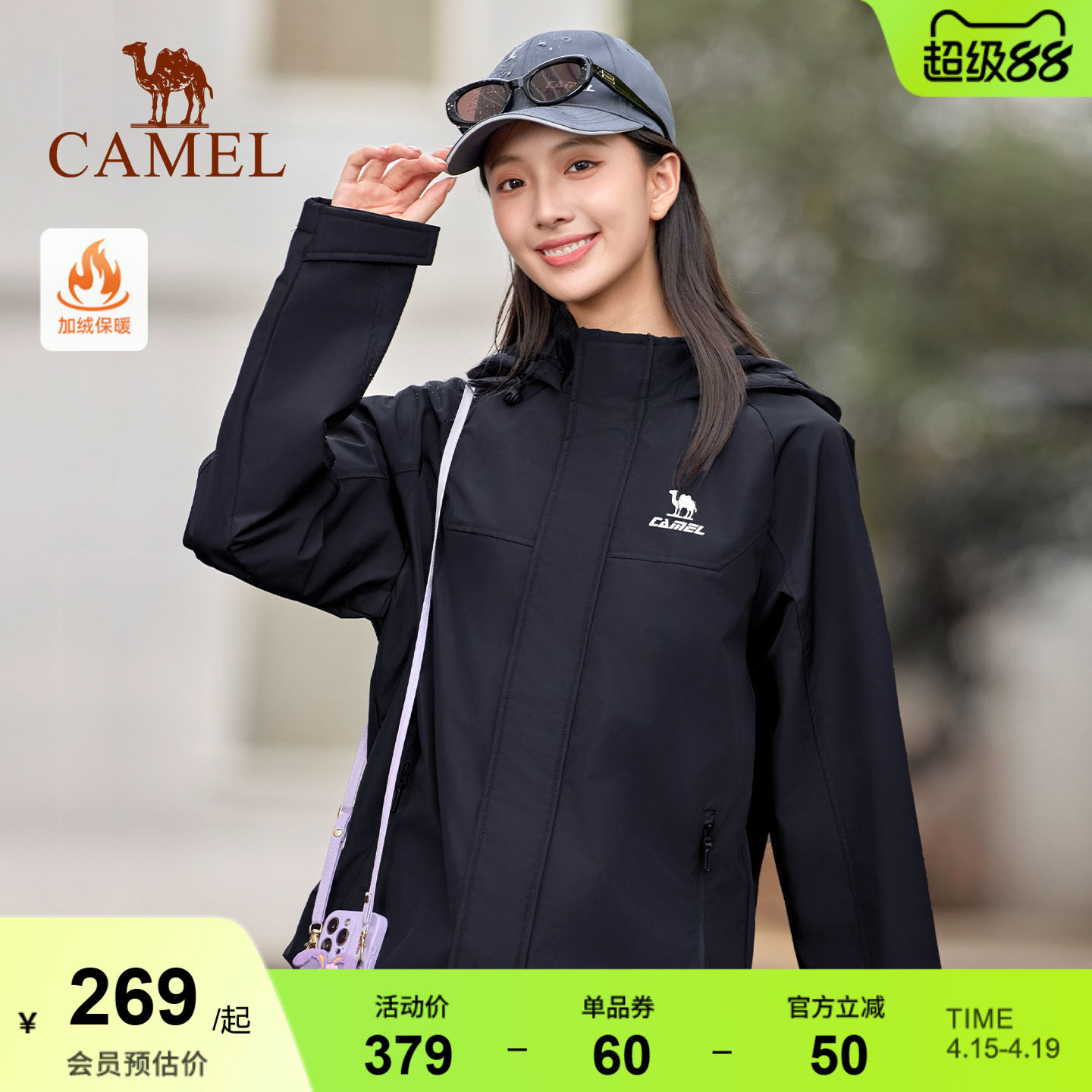骆驼运动外套女秋季风衣外套连帽户外软壳登山防水防风薄绒夹克男
